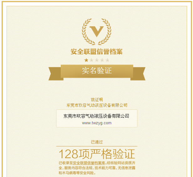 恭喜東莞市玖容氣動液壓設備有限公司獲得了安全聯盟認證!我們通過了128項史上最嚴格的安全檢測,并非常榮幸地載入安全聯盟信譽檔案庫。我們將信守承諾,與安全聯盟200萬站長共同努力,為大家提供安全可靠的產品和服務。玖容增壓缸感謝您的支持!認證詳情請查看榮譽證書http://t.cn/RPICS5j